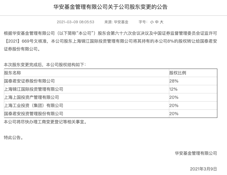 2018年12月,华安证券再度发布公告披露,经证监会核准,原股东国泰君安创投、上海国际信托将各持有的20%的股权分别转让给国泰君安证券和上海上国投资管公司,国泰君安证券也由此直接持有华安基金20%的股权。