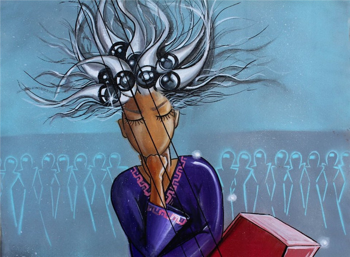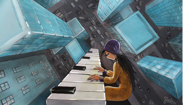 戴着紫色头巾的女子弹着钢琴,一滴泪水滑落脸颊。周身蓝色的摩天大楼汇成海洋,脚下小小的车辆快速地移动,她却全然不顾,沉醉于自己的乐章。这幅画将她的矛盾展现得淋漓尽致。她是坚强的,又是脆弱的,她是优雅的,充满创造力,却又独自一人,黯然神伤。可是,她看起来并不在乎谁能听见她的心声,仅是能够坐在这,自在平和地用音乐表达自己的感受和内在,她就心满意足了。