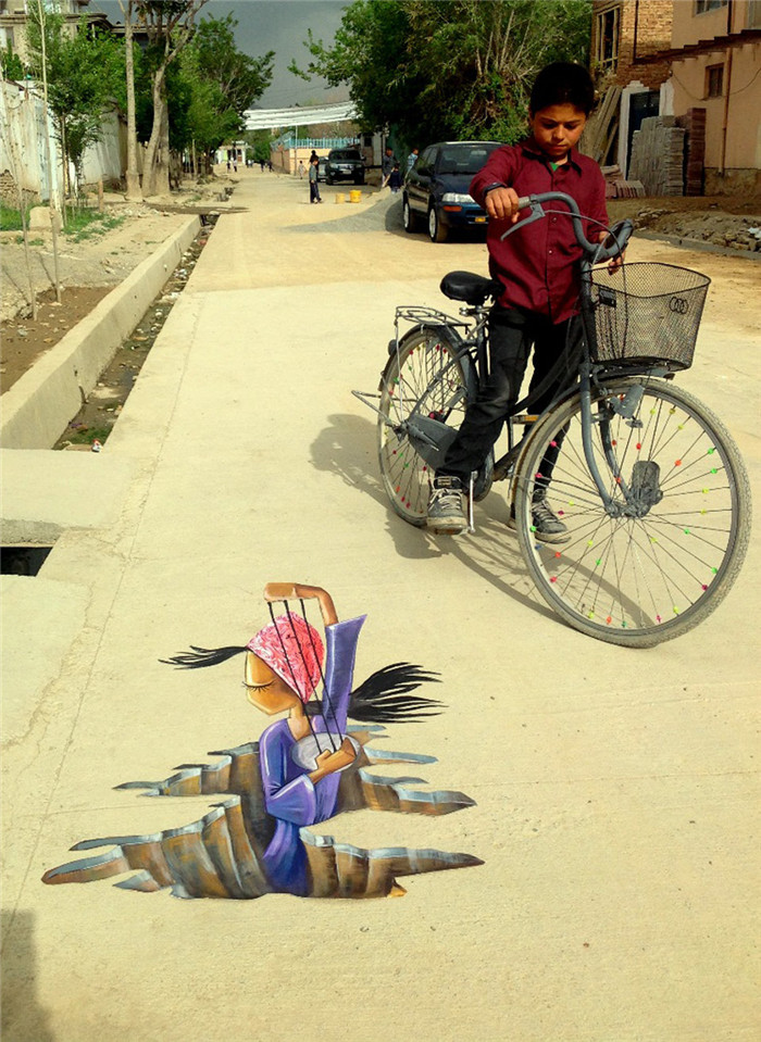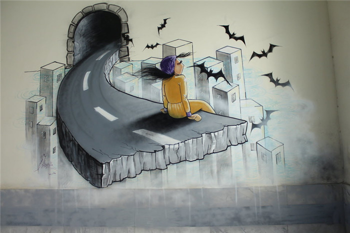 这幅街头艺术画出自Shamsia Hassani之手,她是阿富汗首位杰出的女性街头艺术家。她的父母都是阿富汗人,她于1988年出生于德黑兰,最终迁居喀布尔攻读视觉艺术的学士及硕士学位。目前,Hassani定居喀布尔,在那里,她把城市中的墙壁变成了五彩缤纷的油画布,向她的祖国人民传递和平与希望。