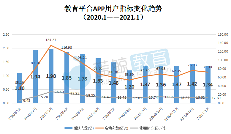 从上图可以看出,受疫情影响教育平台赛道在2020年第一季度时接连上升,在2020年3月末时各数据都达到了流量顶峰,用户规模1.98亿,使用时长26.6亿小时,启动次数高达134.37亿次。但之后便经历了连续数月的下降,直至2020年9月末开始回升,之后长期处在发展较为平缓的阶段。2021年1月末活跃用户1.34亿次,使用时长和启动次数较2020年12月末均有所下降。