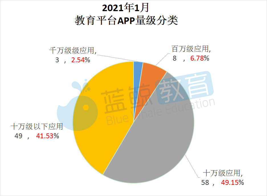 下面,蓝鲸教育智库把118家教育平台APP,按照用户规模,分别以1000万、100万、10万为界限做量级分类,得到的结果如下图所示: