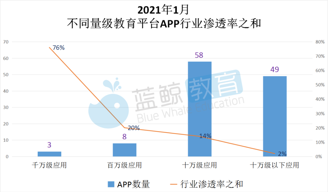 “学习强国”“安全教育平台”“学习通”这三个千万级应用规模的行业渗透率指数高达76%,8个百万级用户规模的APP,用户渗透率指数为20%,十万级应用和十万级以下应用的领域渗透率指数分别为14%与2%。