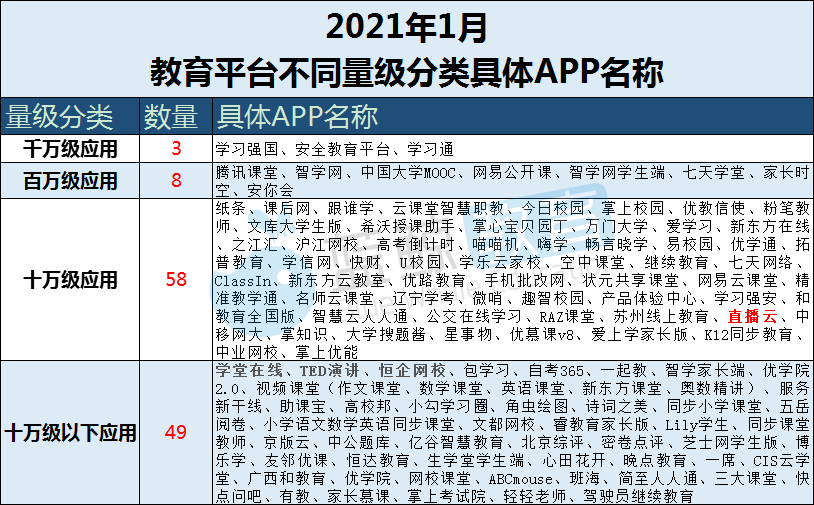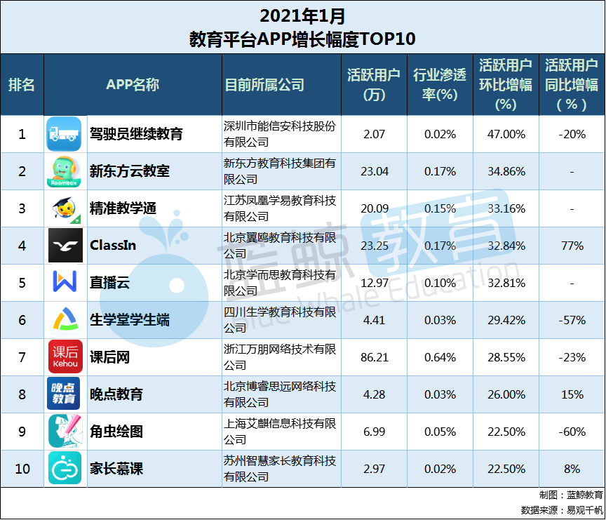2021年1月末用户增速前十的APP分别是:“驾驶员继续教育”“新东方云教室”“精准教学通”“ClassIn”“直播云”“生学堂学生端”“课后网”“晚点教育”“角虫绘图”“家长慕课”。