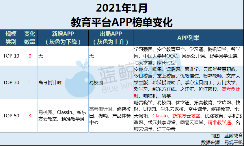为了更好的梳理2021年1月末教育平台赛道具体的APP数据变化,蓝鲸教育智库选取了2020年12月末到2021年1月末教育平台APP的具体榜单变化,下图是“2021年1月教育平台APP榜单变化”:标灰色的APP表示从上一级别甩出到下一级别或者从下一级别进入上一级别,并不算作该级别新增APP;标红的为2021年1月各大TOP排行榜等级上升的APP: