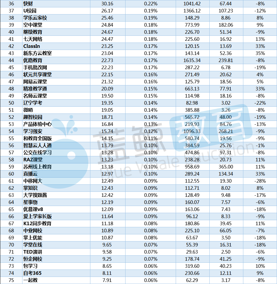 从该榜可以看出,千万级与百万级应用并未发生变化;十万级应用新增一家的企业是“直播云”(上图已标红);“学堂在线”“TED演讲”“恒企网校”(图中标灰的APP)则从十万级应用跌出,成为十万级以下应用。