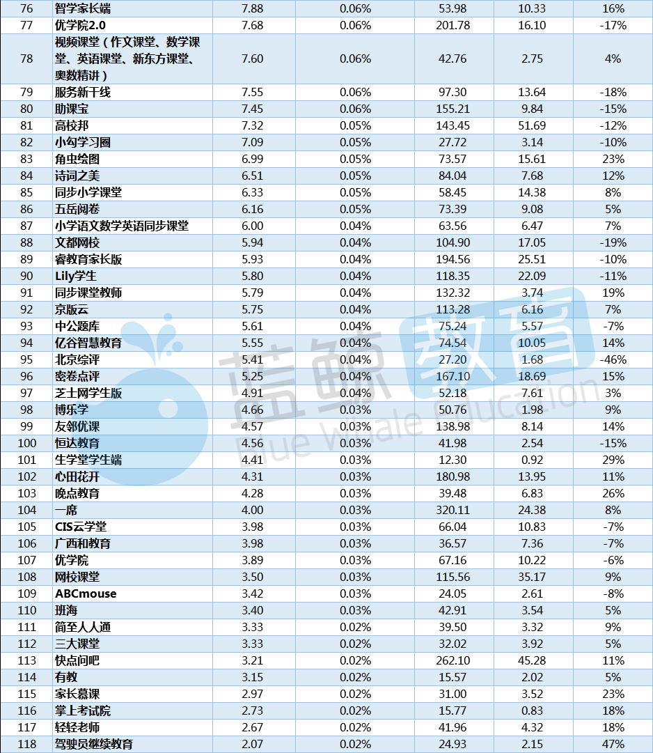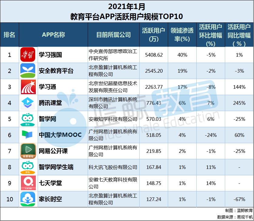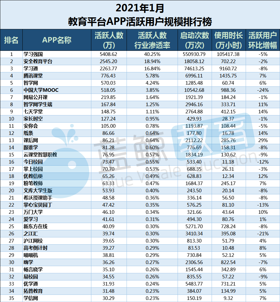下面是2021年1月末118家教育平台活跃APP的详细排名,排名按照用户规模,包括活跃人数、启动次数及使用时长等维度数据,供大家查阅: