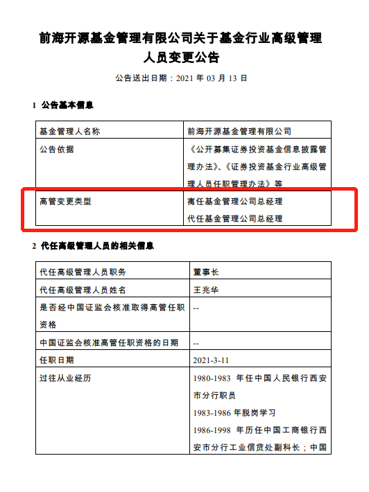 3月13日,前海开源基金公告,原总经理贾红波因个人原因,已于3月11日离任,目前总经理一职由董事长王兆华代任。