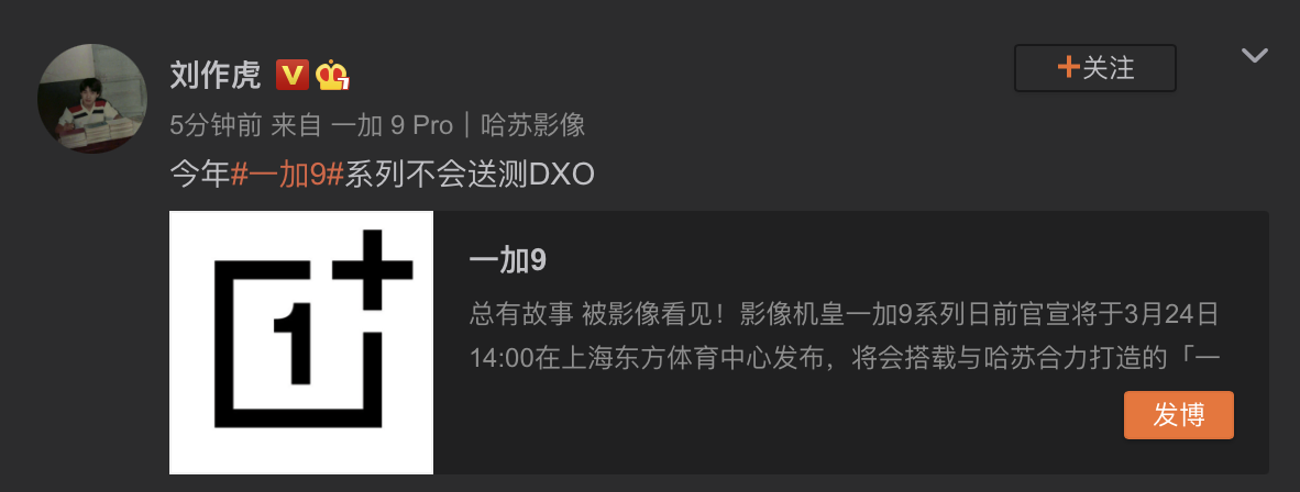 3月13日,一加科技CEO刘作虎在其个人微博发文称,今年一加9系列不会送测DxO。而针对DxO评测OPPO Find X3 Pro“搞错核心参数”一事,OPPO前副总裁沈义人昨日亦在其个人微博@自信的眉毛 表态,称“有钱能使磨推鬼,DxOMark测屏幕不揭膜的教训还没长,现在都可以捏造事实了。”