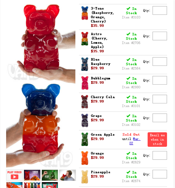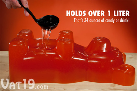 据Jamie介绍,最受欢迎的是软糖类产品。(大概其他产品过于奇葩,没人敢尝试吧。)比如5磅的橡皮熊软糖,它的重量是一般橡皮熊软糖的1400倍,经常卖脱销。“有商业头脑”的网站还为这款橡皮熊软糖做了一系列周边产品,比如“集优雅舒适于一体的”橡皮熊软糖充气沙发、肚子上有个坑能当酒杯当饭碗的橡皮熊软糖。