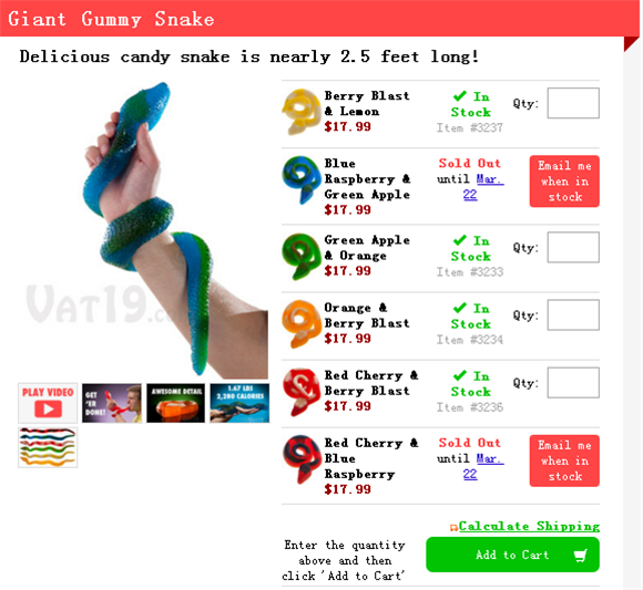 在Vat 19上,你能看到约四百多种神奇的产品,从5磅巨大橡皮熊软糖、3磅的橡皮虫软糖、2.4公尺的蟒蛇軟糖、到无需墨水可永久书写金属笔、吸附磁铁的橡皮泥、能在6分钟内将饮料变成泥状的Slush Mug马克杯。总之,他们专卖稀奇古怪一般销售渠道卖不出去的产品。