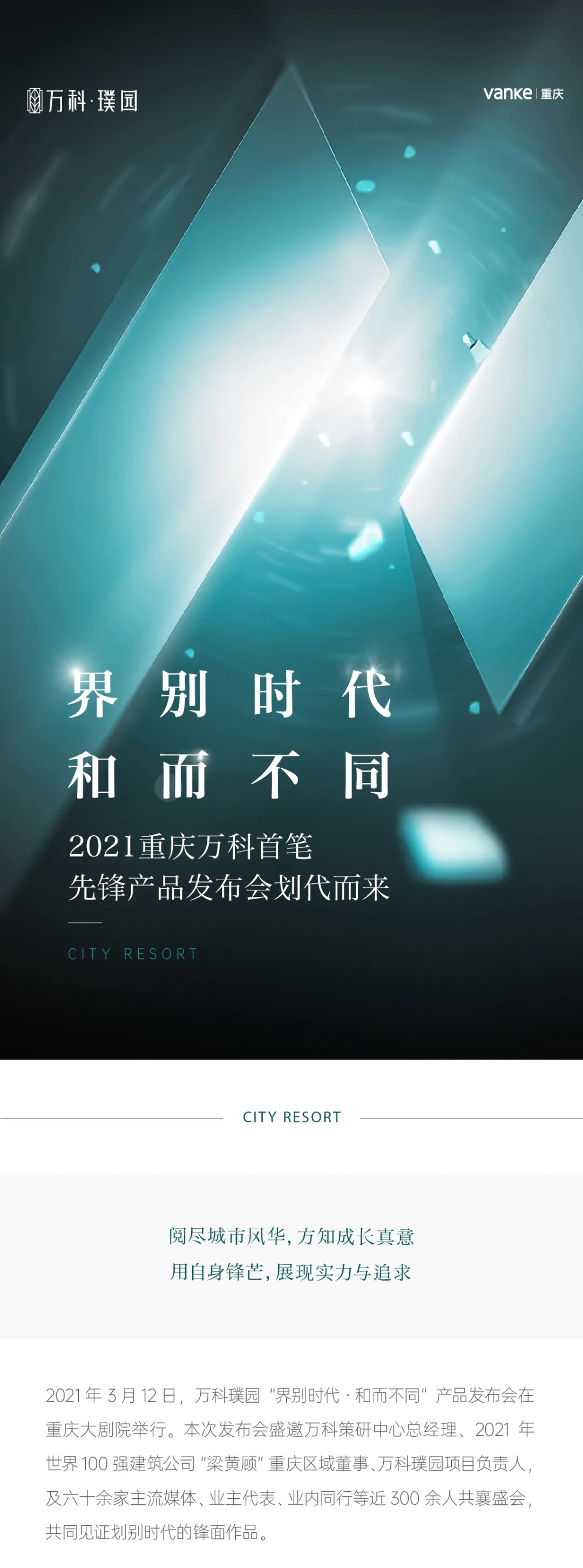2021年3月12日,万科璞园“界别时代·和而不同”产品发布会在重庆大剧院举行。本次发布会盛邀万科策研中心总经理、2021年世界100强建筑公司“梁黄顾”重庆区域董事、万科璞园项目负责人,及六十余家主流媒体、业主代表、业内同行等近300余人共襄盛会,共同见证划别时代的锋面作品。