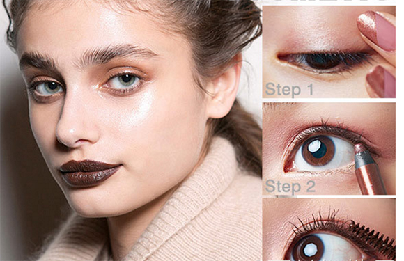 1.眼妆、唇妆整体走暖色调,咖色的眼影和眼线,这样就比较和谐;