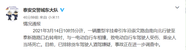 据山东@泰安交警城东大队 微博通报,2021年3月14日10时5分许,一辆重型半挂牵引车沿崇文路由南向北行驶至泰新路路口右转弯时,与一电动自行车相撞,致电动自行车驾驶人受伤、乘坐人当场死亡。目前,已排除货车驾驶人酒驾嫌疑,事故正在进一步调查中。