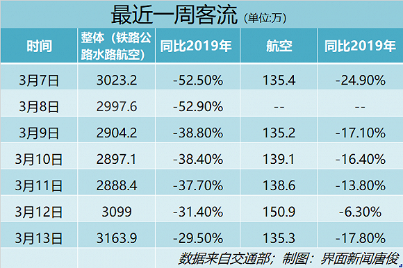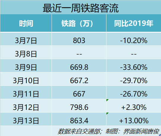 3月13日,铁路客流比前一日增长了64.8万人次,达到863.4万人次,同比2019年涨幅扩大至13%。