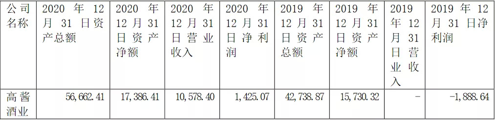 数据显示,2019年高酱酒业没有营业收入,且净亏-1888万元;而2020年,高酱酒业实现营业收入约为1.06亿元,净利润约为1425万元。