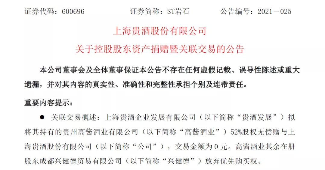 日前,上海贵酒股份有限公司(下称“贵酒股份”,股票简称“ST岩石”),发布了《关于控股股东资产捐赠暨关联交易的公告》,上海贵酒企业发展有限公司(下称“贵酒发展”)拟将其持有的贵州高酱酒业有限公司(下称“高酱酒业”)52%股权无偿赠与贵酒股份,交易金额为0元。