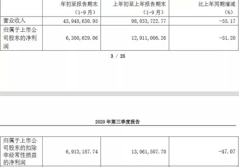 2020年前三季度,贵酒股份实现营业收入约为4394.86万元,同比下滑55%;归属于上市公司股东的净利润约为630.06万元,同比降幅在51%以上,其中酒类销售业务收入仅为2662.87万元,同比增幅在439%左右。