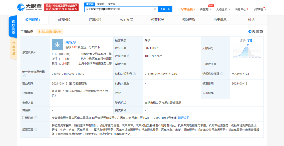 据天眼查APP显示,3月12日,合肥鹏智汽车销售服务有限公司成立,注册资本1000万人民币,法定代表人为朱艳华。经营范围包括新能源汽车整车、新能源汽车电附件、机动车充电销售机动车检测服务、共享汽车租赁服务、汽车市场管理服务、机动车公共停车场服务、机动车零配件市场管理服务等。股权穿透图显示,该公司由小鹏汽车销售有限公司全资持股。