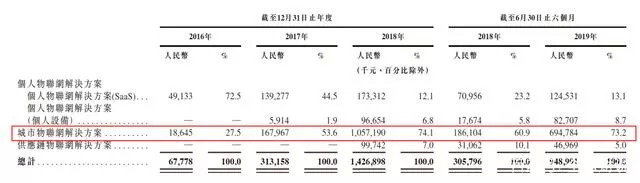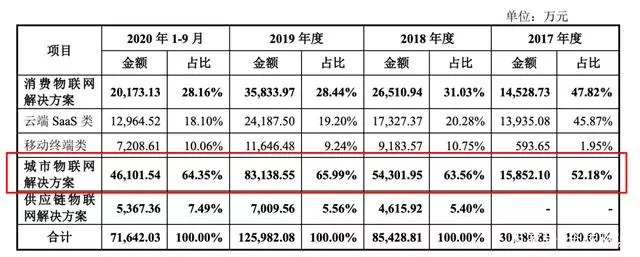 对比两版本招股书2018年的数据看,此前港股招股书披露城市物联网解决方案全年实现营业收入10.57亿元,占总收入比例为74.1%;但在最新A股招股书中,2018年全年该业务实现营业收入为5.43亿元,占比63.56%,该项业务收入诡异大幅减少。