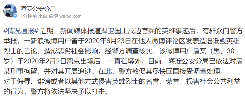 @海淀公安分局 微博3月15日通报,近期,新闻媒体报道捍卫国土戍边官兵的英雄事迹后,有群众向警方举报,一新浪微博用户曾于2020年6月23日在他人微博评论区发表造谣诋毁英雄烈士的言论,造成恶劣社会影响。经警方调查核实,该微博用户潘某(男,30岁)于2020年2月2日离京出境后,一直在境外。目前,海淀公安分局已依法对潘某刑事拘留,并对其开展追逃。在此,警方敦促其尽快回国接受调查处理。