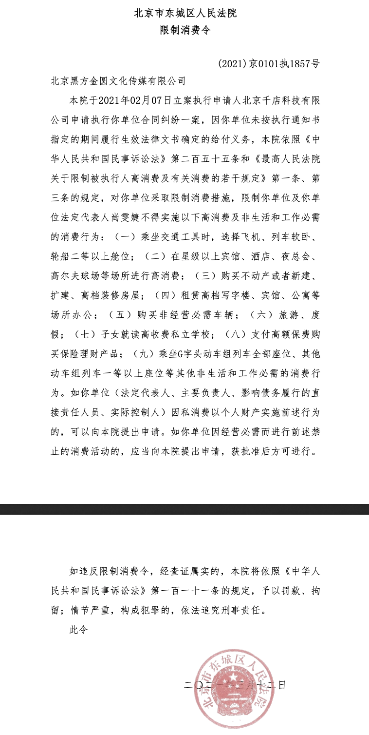据天眼查APP显示,3月12日,尚雯婕新增一条限制消费令,案号为(2021)京0101执1857号,立案时间为2021年2月7日,执行法院为北京市东城区人民法院,限制消费人员为北京黑方金圆文化传媒有限公司及公司法定代表人尚雯婕,申请人为北京千店科技有限公司。