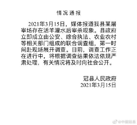针对有媒体报道“屠宰场给活羊灌水后宰杀”一事,山东省冠县官方微博3月15日通报称,县政府立即成立由公安、综合执法、农业农村等相关部门组成联合调查组,第一时间赶赴现场展开调查。目前,调查工作正在进行中,将根据调查结果依法依规严肃处理,有关情况将及时向社会公开。