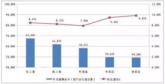 长三角区域赚钱最多。从区域薪酬水平来看:2015年长三角地区薪资最高(6.74万元);珠三角地区位列第二(6.18万元);环渤海地区位居第三(5.82万元);中、西部地区排名最低分别为4.96万元和4.92万元。
