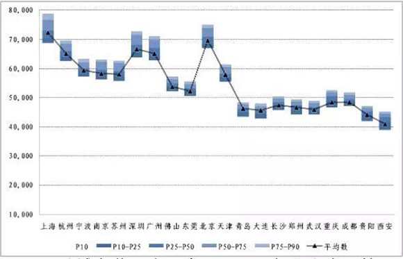 一线城市在保持领先的同时,杭州、宁波、南京、苏州等二线明星城市奋起直追,整体薪酬水平接近一线城市。其中,杭州薪酬的75分位值达69 579元,仅落后广州0.3个百分点。杭州薪资水平走高,在于杭州市政府大力发展信息经济与中国(杭州)跨境电子商务综合试验区、杭州国家自主创新示范区叠加优势的发挥。