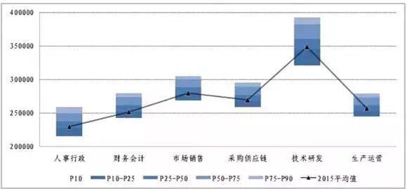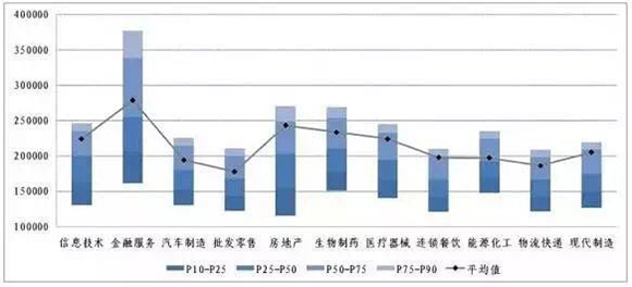 金融业薪酬拔得头筹。金融业收入遥遥领先其他行业。调研显示,2015年金融服务行业薪酬的75分位值为366 365元。而排名第二的生物制药行业的薪酬75分位值为277 207元,比金融服务行业少了约25%;房地产行业排名第三,其薪酬的75分位值为270 287元,主要得益于一线城市房地产市场的逐步回暖。