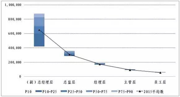 企业中层收入增长最快。总经理层年薪的75分位值为878 663元,总监层为357 487元,经理层为190 960元,主管层为103 376元,员工层为62 406元。其中,总经理层年薪为员工层的14倍之多。这表明对企业而言,高级管理人员依然稀缺,企业愿意支付高额的年薪,吸引高级管理人员加盟。