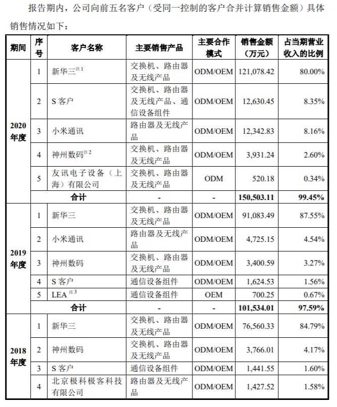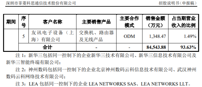 招股书显示,报告期内,菲菱科思前五大客户的销售金额占营收的比例分别为93.63%、97.59%、99.45%。其中对新华三的销售金额占营收比例分别为84.79%、87.55%和80.00%,均在八成以上,客户集中度较高。