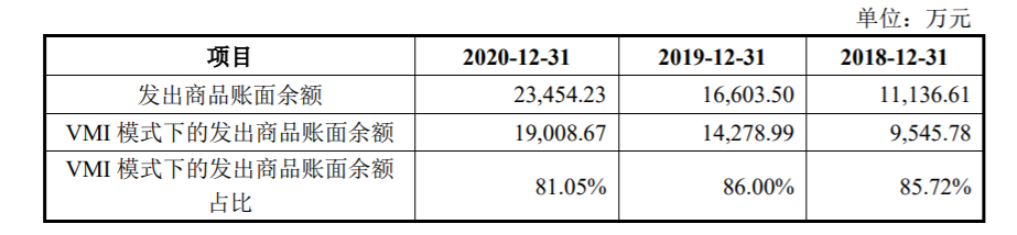 招股书披露,菲菱科思发出商品主要为VMI模式下的发出商品。报告期各期末,菲菱科思发出商品账面余额分别为11,136.61万元、16,109.87 万元和23,454.23万元,而VMI模式下的发出商品账面余额分别为9,545.78万元、14,278.99万元和19,008.67万元,占比分别为85.72%、86.00%和81.05%。