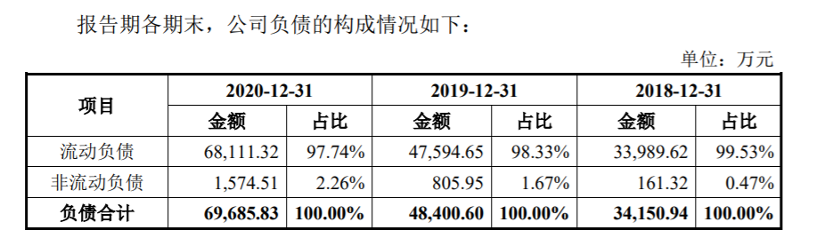 招股书显示,菲菱科思负债主要为流动负债,负债规模呈增长趋势,负债主要由短期借款、应付票据及应付账款构成,报告期各期末,上述负债占流动负债的比重均超过90%,其中应付账款占比最重,分别为26,295.07万元、39,292.19万元和50,774.99万元,占流动负债的比例分别为77.36%、82.56%和74.55%,主要为应付供应商的材料款。