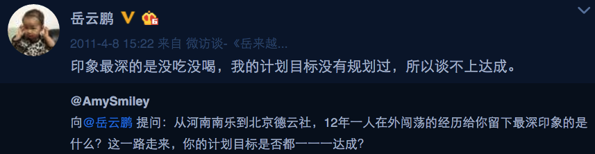 那天演出前,曾有网友在微博中问他,“从1999年走出河南南乐到2011年举办自己的专场,12年一人在外闯荡,印象最深的是什么?你的计划目标是否一一达成?”
