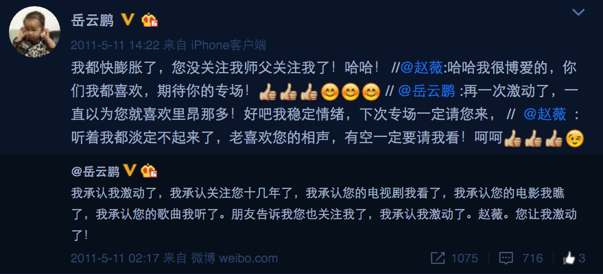 这些节目不光增加了岳云鹏的曝光度,也让他在两年间迅速认识了因宣传期而上节目众多明星艺人,极大的扩展了他在娱乐圈的人脉。翻看他那两年的微博,王菲、赵薇、章子怡等人都跟他有过多次互动。