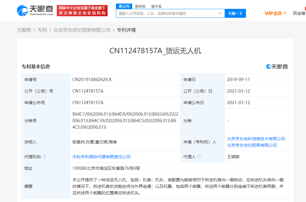 据天眼查APP显示,近日,北京京东世纪贸易有限公司公开专利“货运无人机”,专利公开日期为2021年3月12日,公开号为CN112478157A。
