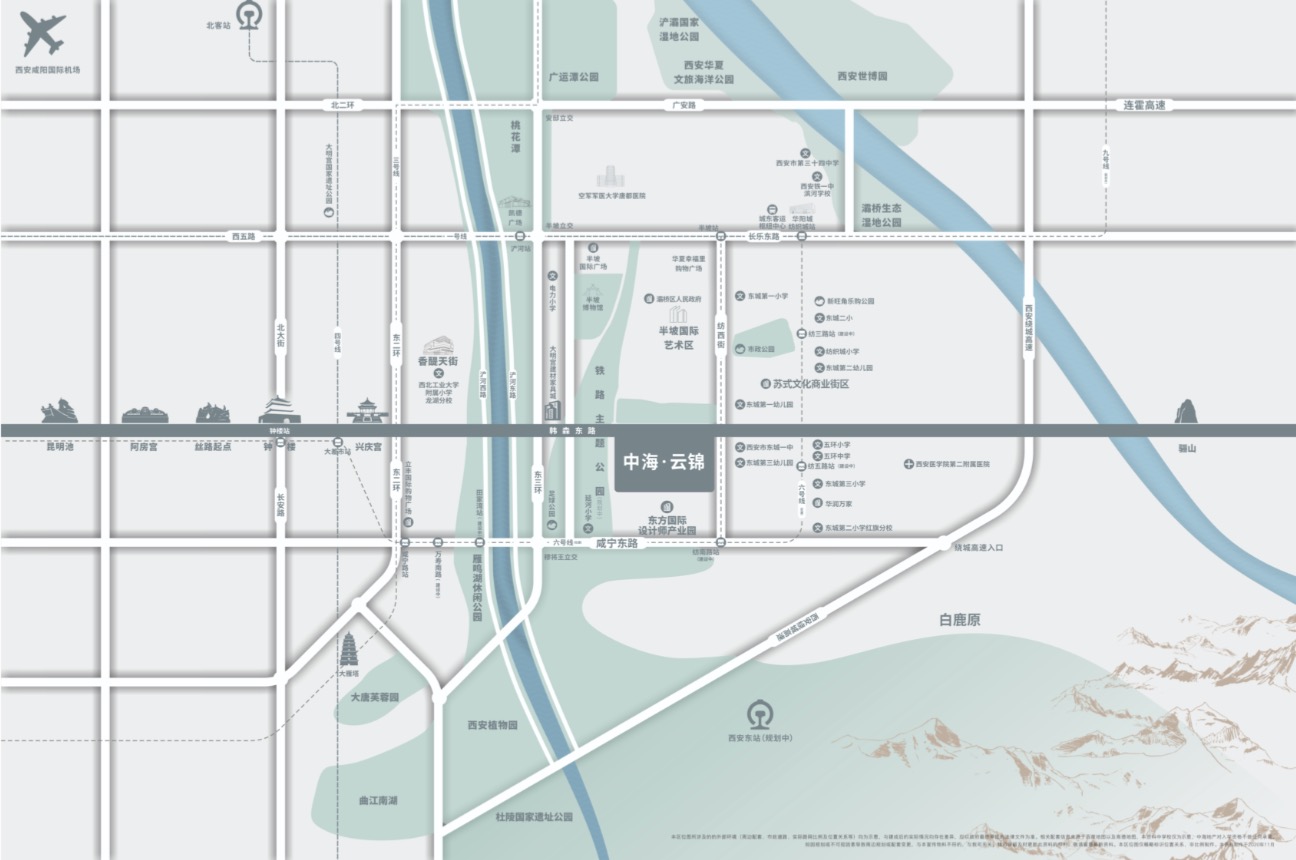 项目与昆明池、钟楼、骊山等西安历史文脉东西向同处一轴,文化底蕴丰富;并同时位于南北侧生态中轴之上,紧邻铁路主题公园,更有世博园植物园等南北贯通,生态资源丰富。