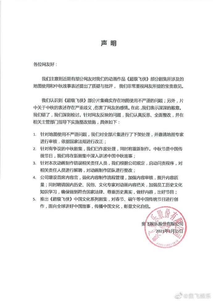 3月15日,奥飞娱乐通过官方微博发布声明称,公司注意到近期有部分网友对公司的动画作品《超级飞侠》部分剧集所涉及的地图使用和中秋故事表述提出了质疑与批评。在此,公司表示深深的歉意。