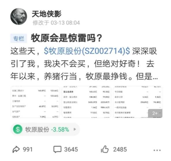 过于优秀的业绩引起了投资者的兴趣。一位雪球的球友“星辉雪夜”是牧原股份的重仓者,过去一段时间,他不断找到“天地侠影”帮忙看看“牧原的财报有没有问题”。于是在3月13日这天,“天地侠影”一篇《牧原股份会是惊雷吗》横空出世,引发网友热议,券商解释,牧原股份市值下跌。