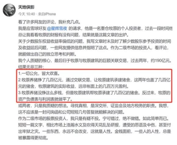 随后, “天地侠影”表示,写文章时没有及时了解少数股东参与投资的时间及收益延后问题。但对于“盖猪圈”的关联交易,仍保持质疑,认为可能存在三种情况:一种是一切公允,皆大欢喜;另一种是牧原股份养猪赚到几百亿元,通过关联交易让牧原建筑承建猪舍,牧原建筑也盖了几百亿元猪舍,实际收益不止账面上的几百万元;还有一种可能,是牧原股份养猪没有其财报中显示的那么挣钱,但是通过牧原建筑关联交易盖了几百亿元的猪舍,将资产负债表与利润表做平了。