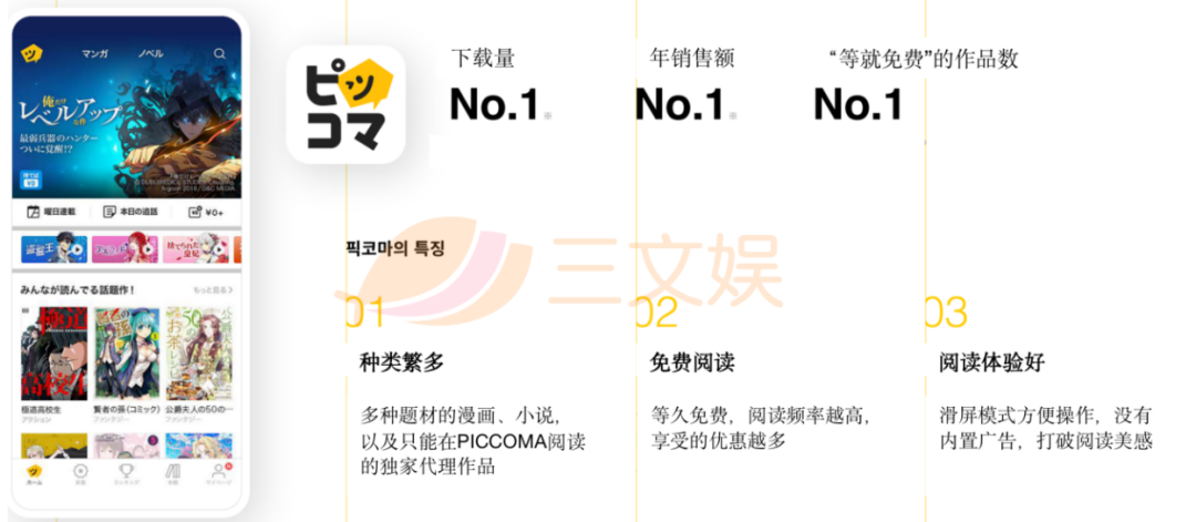 三文娱曾多次介绍过,PICCOMA的整体模式都在照搬在韩国已经获得验证的KakaoPage的模式。而在2016年PICCOMA上架的时期,即便是同属韩国漫画平台的Line Manga,也在日本市场采取了保守模式——扫描纸质漫画照搬网络,而失了先机。而且PICCOMA精准投放的电视广告,扩大了APP的曝光量,起到了很好的转化用户的效果。
