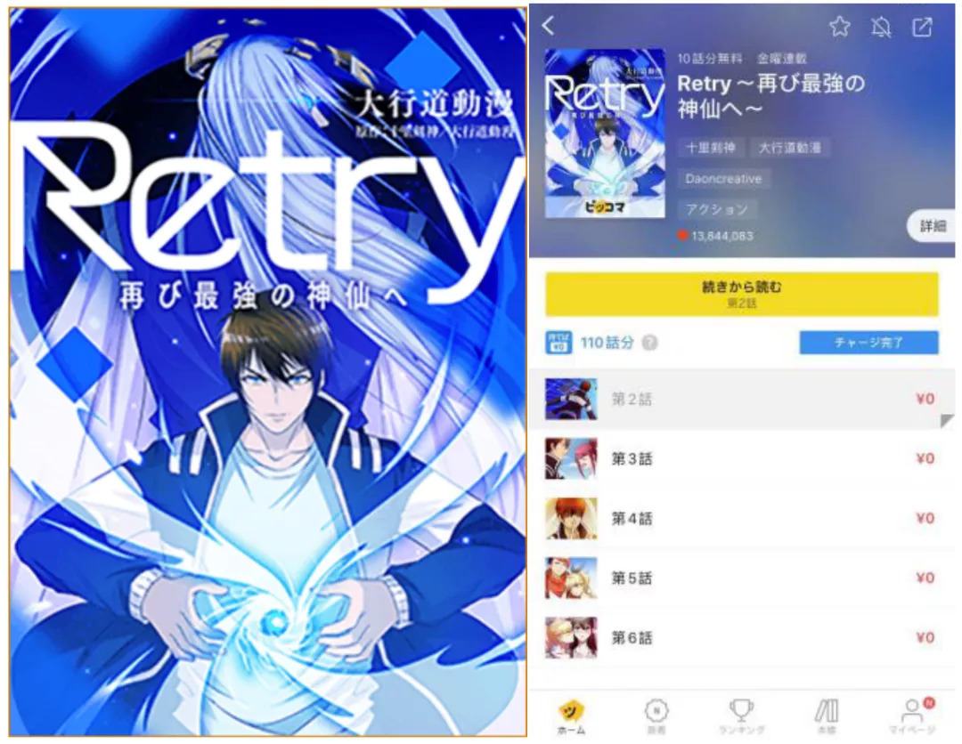 这近24亿元年交易额背后,有40~50%的销售份额来自译成日文的韩漫,也有来自中国市场的《重生之都市修仙》(PICCOMA译名:Retry~再び最強の神仙へ~)等国产漫画。