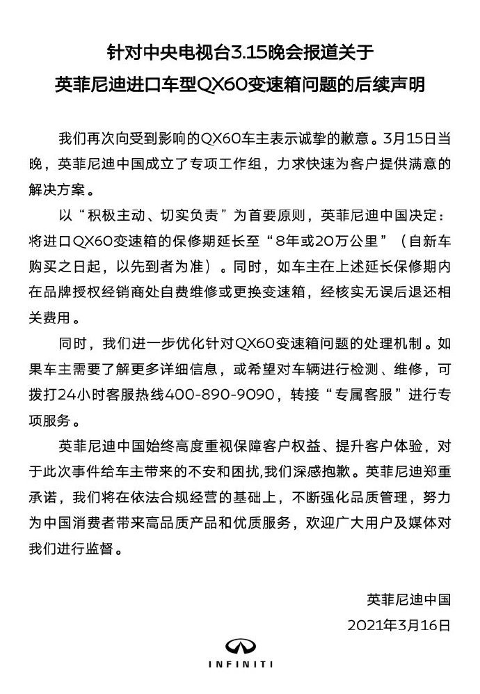 3月16日早间,英菲尼迪在官方微博就QX60变速箱故障等问题再次发布声明称,英菲尼迪中国决定,将进口QX60变速箱保修期延长至“8年或20万公里”(自新车购买之日起,以先到者为准)。同时,将进一步优化针对QX60变速箱问题的处理机制。