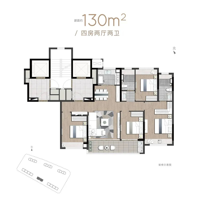 此户型为130㎡户型,2号楼601室(此为工程门牌,可能与公安门牌不一致)装修及家居布置示意图,非交付标准示意,仅供参考。不同楼栋间该户型建筑面积以及公区、室内部分功能区尺寸略有差异。空调外机位为共用机位,相同户型因装修、楼栋、楼层、单元、朝向等差别,局部结构、面积、部分及电器安装位置等略有不同,最终以合同约定为准。