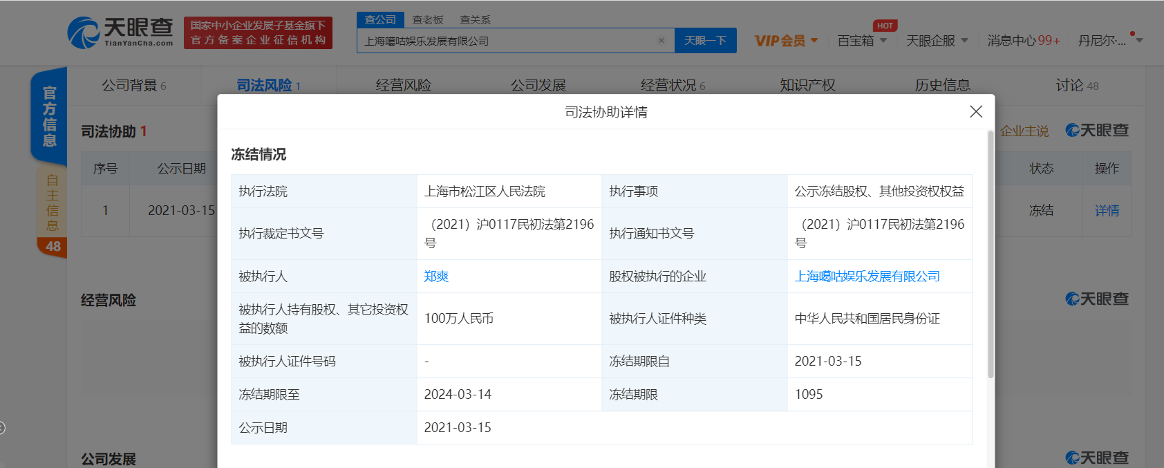 据天眼查APP显示,郑爽2021年3月15日新增股权冻结信息,冻结股权标的企业为上海噶咕娱乐发展有限公司,执行法院为上海市松江区人民法院,被冻结股权共100万人民币,冻结期限至2024-03-14。