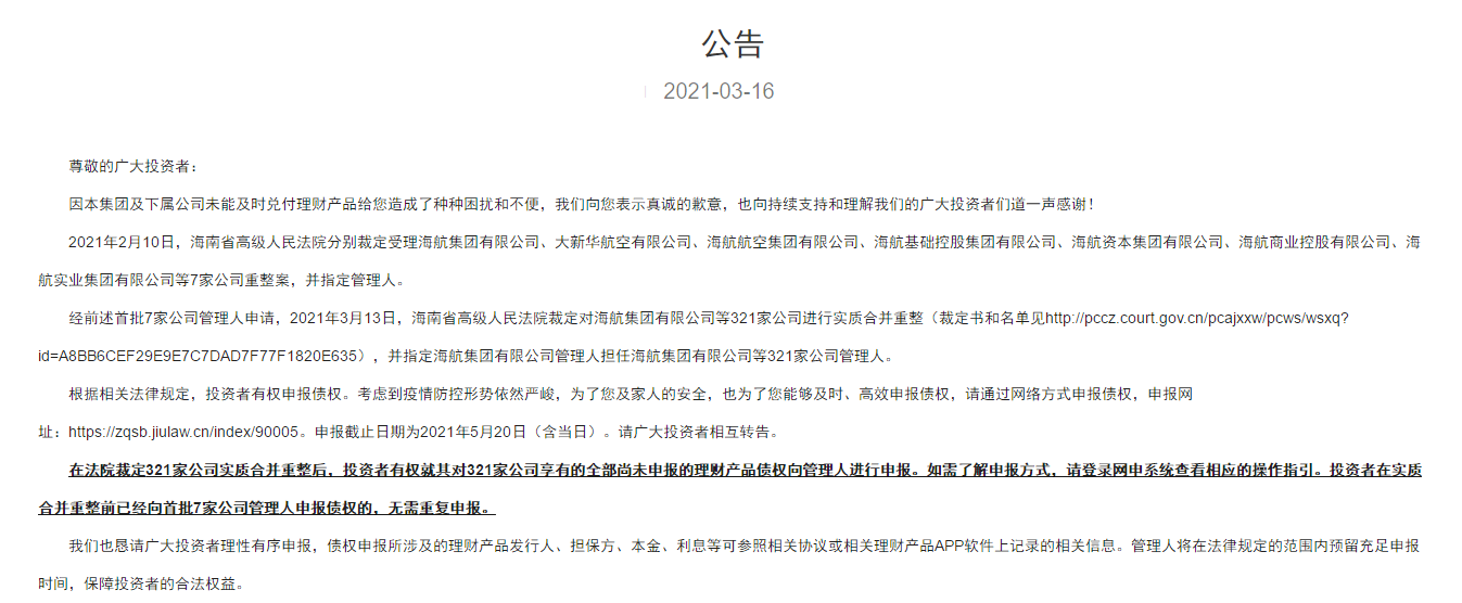 3月16日,海航集团在官网公告,因集团及下属公司未能及时兑付理财产品,向投资者表示真诚的歉意。在法院裁定321家公司实质合并重整后,投资者有权就其对321家公司享有的全部尚未申报的理财产品债权向管理人进行申报。