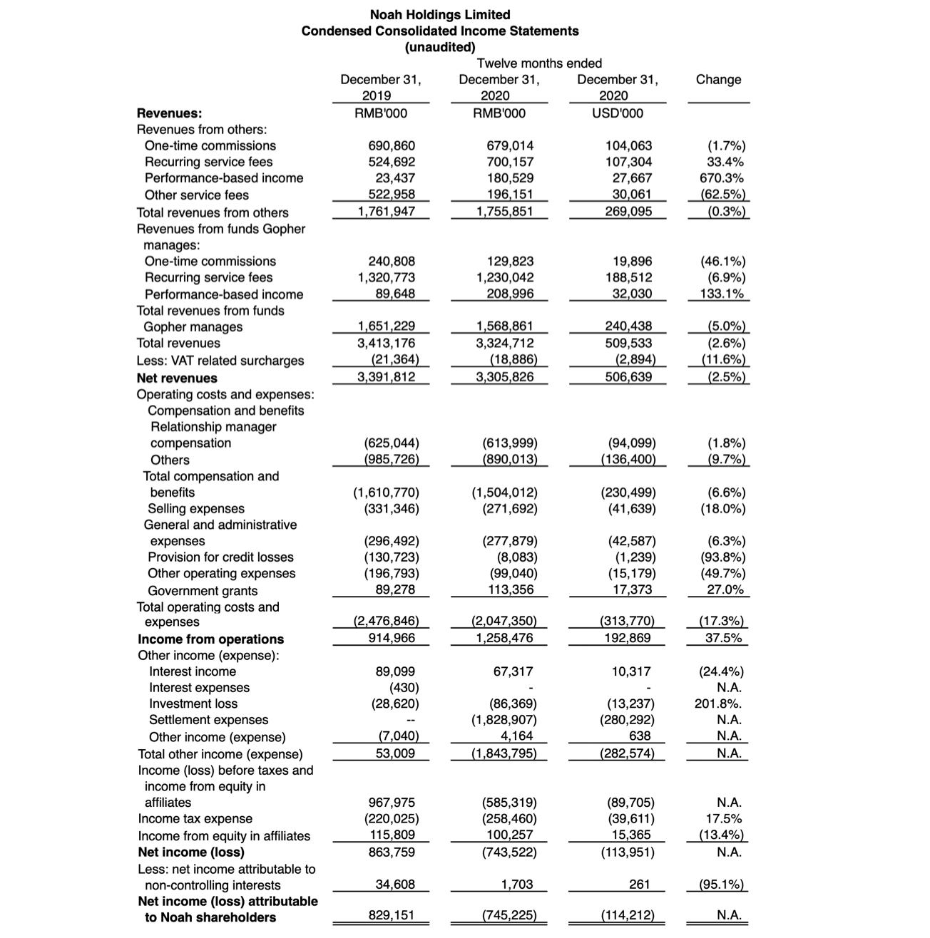 美东时间3月15日盘后,诺亚财富(NYSE:NOAH)发布未经审计的2020年财务数据。2020年,诺亚财富净收入33亿元,同比下降2.5%;净亏损7.45亿元,去年盈利8.2亿元。