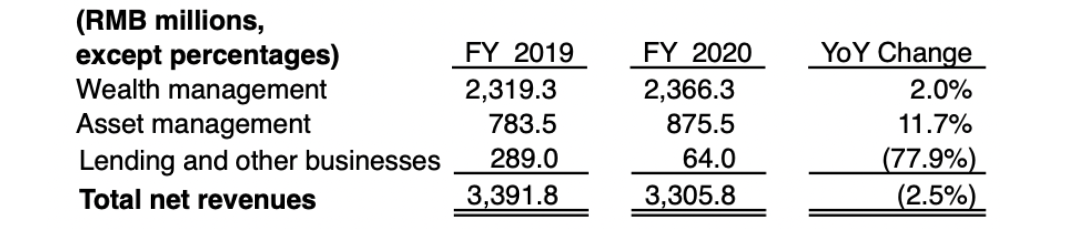 就诺亚财富2020年业务表现,诺亚全年净收入为33亿元。其中,在财富管理业务板块,一次性佣金净收入为7.62亿,同比下降17.5%,主要因为疫情导致代销的保险产品减少;经常性服务费收入为12.77亿元,同比增长11.1%;绩效收入增加,由于共同基金和私募股权基金业绩收入增加;其他服务费收入缩水,受疫情影响导致增值服务减少。