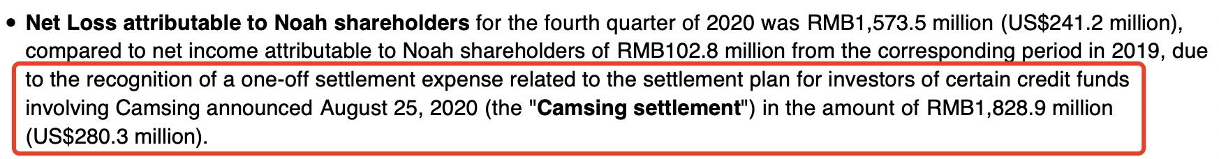 诺亚财富将“承兴案”和解费用部分计入第四季度财务数据,期内净亏损15亿,去年盈利1.02亿。报告称,在2020年8月25日,诺亚宣布承兴案信贷基金投资者的和解协议,相关的一次性结算费用金额为18.289亿元。诺亚财富方面表示,全年净收入下降主要因其他服务费减少,全年亏损的原因是18亿“承兴案”和解费。