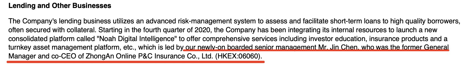 值得注意的是,在第四季度开始,诺亚财富推出“诺亚数字智能”(Noah Digital Intelligence)平台,涉及保险和资产管理等业务。报告指出,该平台负责人是原众安在线(06060.HK)总经理兼联席CEO陈劲。
